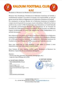 Face à ce comportement jugé inapproprié , le Kaloum FC ( KFC ) , club de Ligue 2 et membre statutaire de la Fédération guinéenne de football, a adressé un courrier au Comité exécutif de la Féguifoot avec pour objet : « Information sur des faits graves d’abus de pouvoir et de violation du Code d’Ethique de la FIFA par Monsieur SORY DOUMBOUYA, Président de la Fédération Guinéenne de Football ».