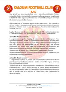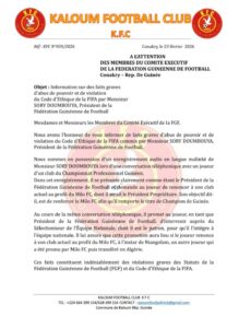 Face à ce comportement jugé inapproprié , le Kaloum FC ( KFC ) , club de Ligue 2 et membre statutaire de la Fédération guinéenne de football, a adressé un courrier au Comité exécutif de la Féguifoot avec pour objet : « Information sur des faits graves d’abus de pouvoir et de violation du Code d’Ethique de la FIFA par Monsieur SORY DOUMBOUYA, Président de la Fédération Guinéenne de Football ».
