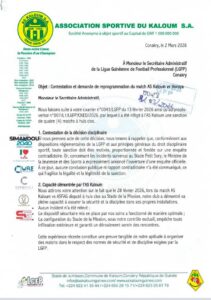 À travers un courrier adressé au Secrétaire Administratif de la Ligue Guinéenne de Football Professionnel (LGFP), l’AS Kaloum conteste la sanction de quatre matchs à huis clos qui lui a été infligée par la Commission Normes, Éthique et Discipline