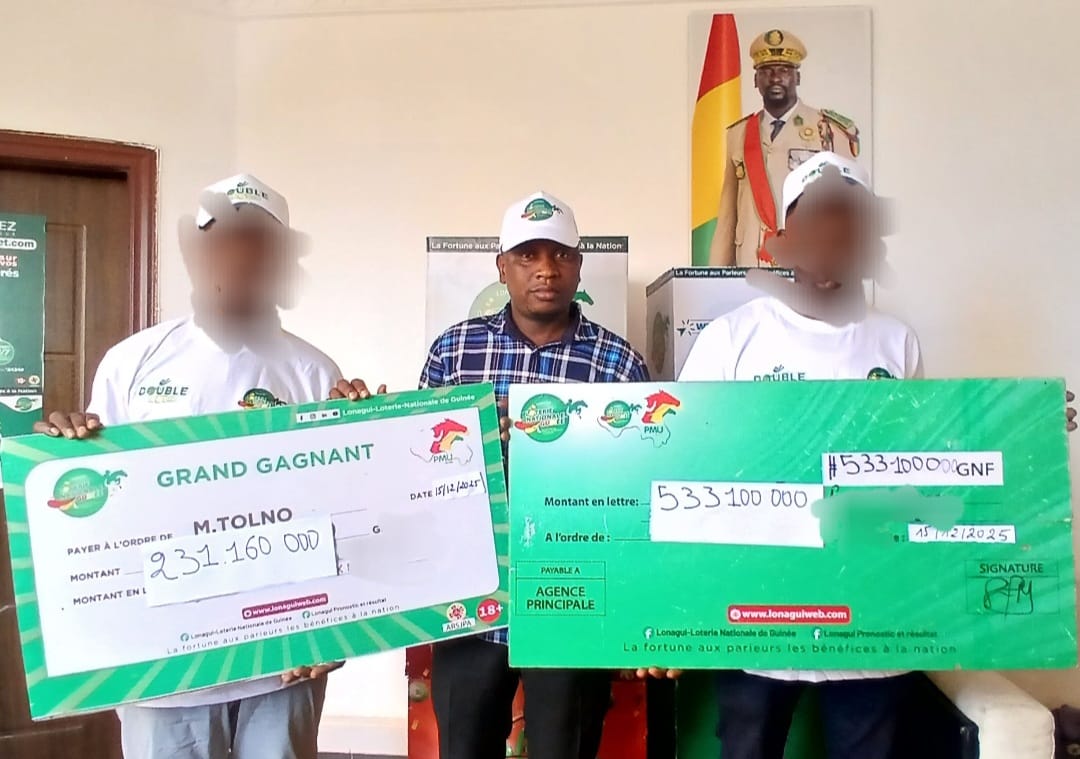 Deux heureux parieurs de la Loterie Nationale de Guinée (Lonagui ), avec pour noms M.Diallo et Tolno , ont remporté respectivement 533 100 000 GNF et 231 160 000 GNF , soit un total de 764 260 000 GNF . Les chèques leur ont été remis ce lundi 15 décembre 2025 à Conakry par le responsable promotion et publicitaire de la Lonagui. M. Elhadj Sala Sidibé lors d’une cérémonie organisée au siège de la Lonagui situé à la citée ministerielle dans la commune de Dixinn .