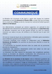Après les incidents survenus lors de la rencontre de Ligue 1 entre Hafia FC et l’association Sportive de Kaloum ( ASK) dimanche 22 février 2026 , le ministère de la jeunesse et des sports annonce l’ouverture immédiate d’une enquête afin d’identifier et situer les responsables de ces agissements.